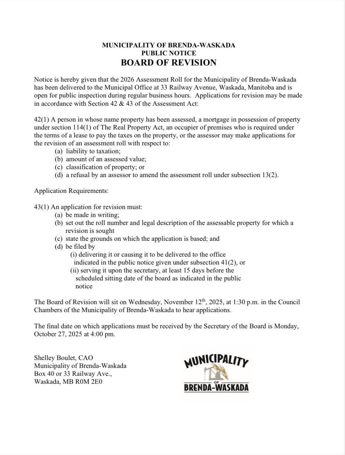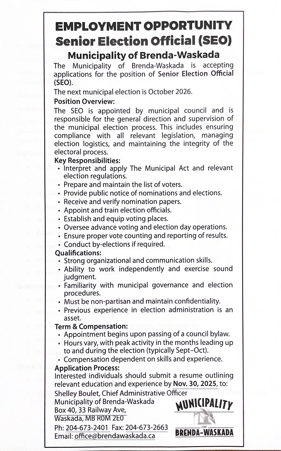 -The Municipality would like to be more effective in providing important information to ratepayers to make critical decisions. The municipality asks ratepayers to update their contact information. The Municipality has an alert information system that sends out these important messages to notify customers of any important messages. Call the municipal office at 204-673-2401 to update your contact information.