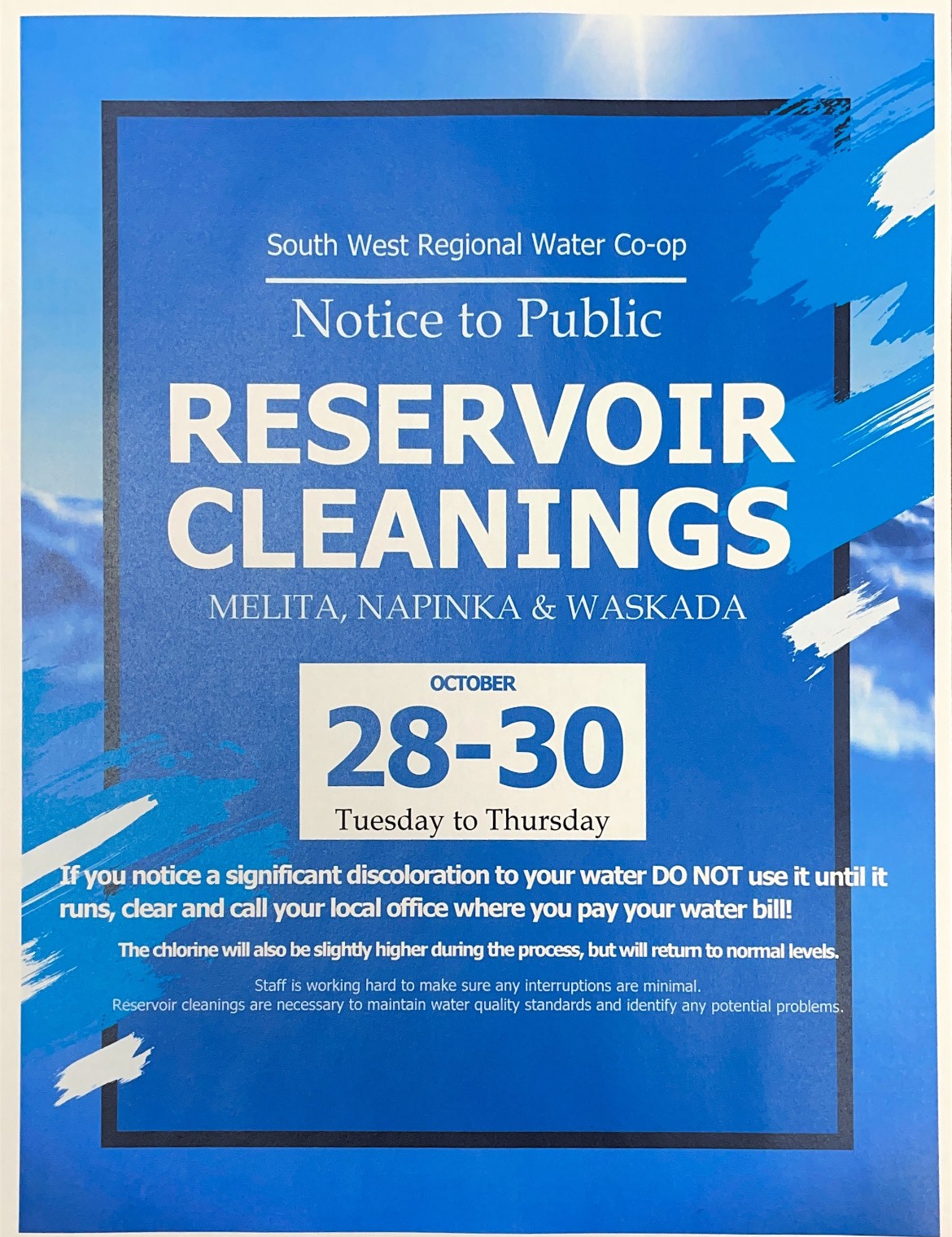 -Please be diligent to check any outside taps, properties that are abandoned or homes of snowbirds for any water leaks. Please notify the office of any ground disturbances of water that may appear. If you notice something that needs to be checked, please contact the municipal office.